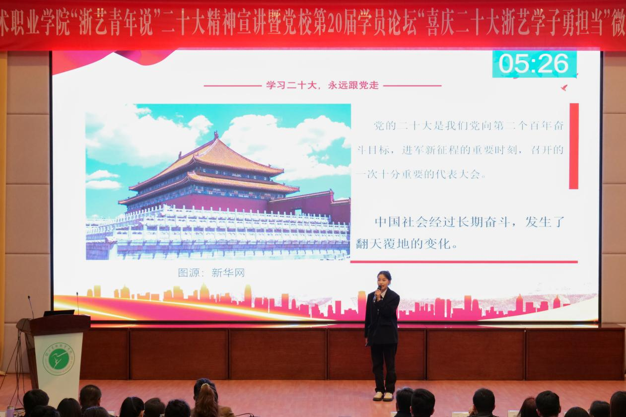 来自各二级学院的12名党校学员精神饱满,慷慨激昂,贴合实际,紧紧围绕比赛主题,从当代青年学生的视角,通过一个个鲜活真实的事例,阐述自己对党的二十大精神的理解和感悟,将党的二十大报告中的理论知识融入到一个个日常学习工作的场景和故事中,为在座评委和党校学员呈现了一堂通俗易懂、内容丰富、印象深刻的微党课,展现了作为一名浙艺学子和党校学员应有的精神风貌和责任担当。
