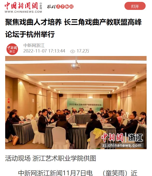 中国新闻网:聚焦戏曲人才培养 长三角戏曲产教联盟高峰论坛于杭州举行