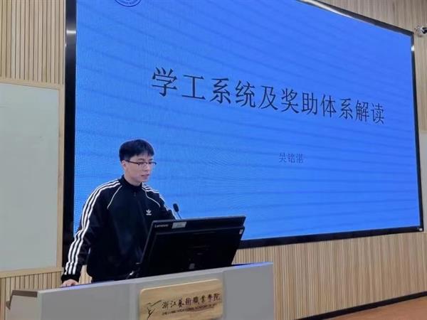 辅导员吴铭湛向大家介绍了学工系统,解读了奖助贷等条例。他表示要利用好今日校园APP,规范日常考勤,管理好自己的大学校园生活。