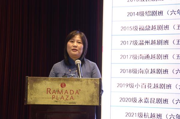 周伟君分享了浙艺校团合作培养戏曲表演人才的现代学徒制实践的经验,从创新“现代学徒制”人才培养模式,培养剧种传承人才;聚资源、推剧目、出人才,校团合作实现产教融合;专业建设、产教融合、理论研究齐头并进,成效显著三方面论述了浙艺戏曲表演专业十五年来探索实践现代学徒制人才培养模式的成果与经验。周伟君说到,“浙艺戏曲表演专业现代学徒制改革以培养兼具传承与创新能力的新时代戏曲表演人才为核心,以校团双元主体合作机制为基础,以导演制教学方法改革和剧目驱动式教学模式创新为纽带,积极构建起了戏曲人才成长规律与现代教育主张相契合的现代学徒制人才培养模式,走出了一条融科班培养与学校教育之所长的戏曲人才培养新路径,为新时代戏曲人才培养提供了浙艺经验。”