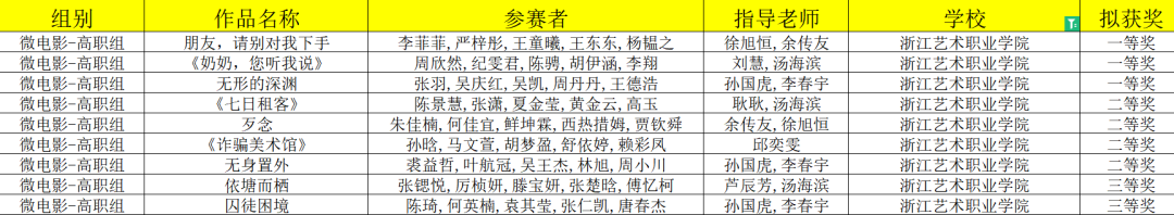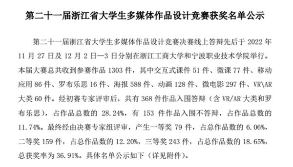 近日,第二十一届浙江省大学生多媒体作品设计竞赛圆满落幕。本届竞赛共有参赛作品1303件,浙艺戏剧影视学院选送的9件微电影(高职组)作品进入决赛答辩。经过激烈角逐,学院最终荣获一等奖3项、二等奖4项、三等奖2项。其中,一等奖获奖作品数占总数的37.5%,名列全省高职院校第一名。