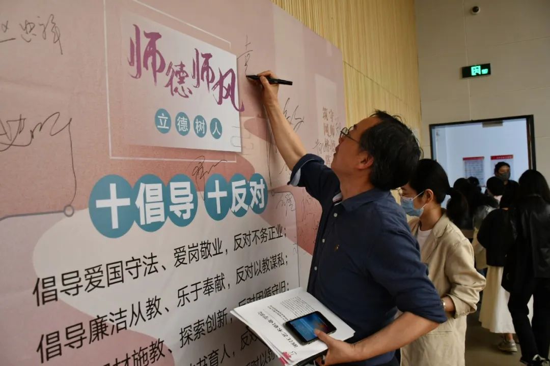 全体教师签署了《戏剧影视学院师德师风个人承诺书》,在师德师风,立德树人——“十倡导 十反对”倡议展板上签字,郑重承诺以德立教、廉洁从教、静心教书、潜心育人,争做“四有”好教师。