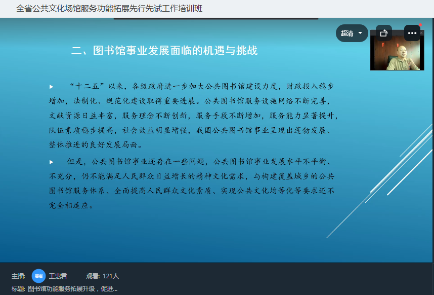 浙江省推进公共文化场馆服务功能拓展先行先试工作一年以来,推动、挖掘了公共文化场馆功能外向拓展和服务融合,探索、丰富、提升了公共文化场馆服务效能,各试点单位涌现出了诸多好做法、好经验。本次培训班的举办,就是为一系列体现浙江水平先行先试成果提供展示交流的平台,也是为全省各地全面推进功能拓展工作提供借鉴,进一步推进公共文化服务高质量发展,助力浙江高质量发展建设共同富裕示范区。