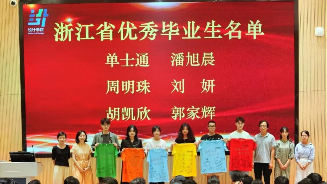 各教研室主任为“省优”毕业生赠送代表“青春设计”的五色T恤。