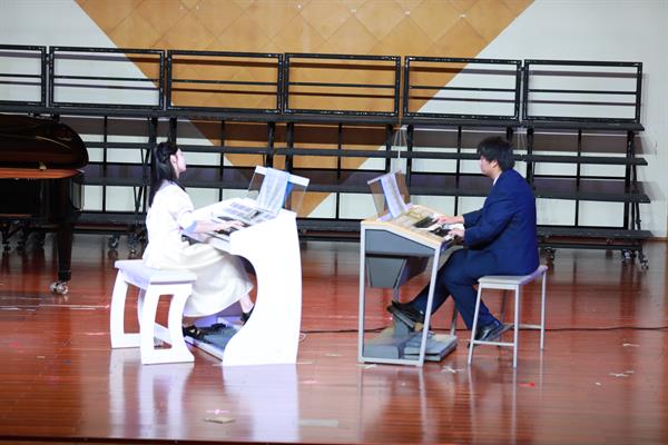 叶羽茜和林兢赫演奏了双排键重奏《美女与野兽》,现代电声乐器的合作带来的震撼音效,其交响化、立体化让听众恍惚置身于迪士尼大片中。