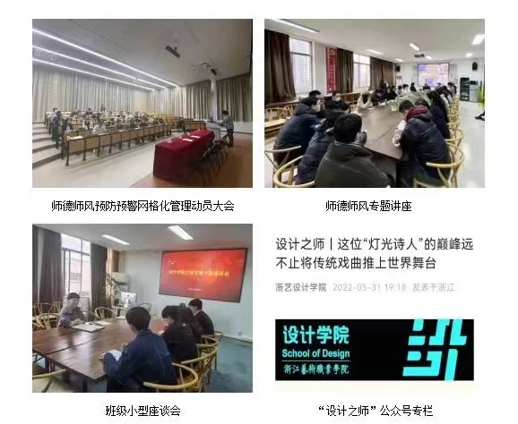 开学以来,学院制订了《设计学院师德师风网格化预防预警工作实施方案》;召开了师德师风预防预警网格化管理动员大会;邀请了专家作师德师风专题讲座开启全体教职工的新年第一课;组织了推门看课和约课研讨聚焦课堂育德;签订了教职工师德师风承诺书;召开了全院在校12个班级的小型座谈会;开设了师德师风意见箱和电子邮箱;开辟了“设计之师” 公众号专栏,在全院范围内营造出尊师重教、崇德养德的浓厚氛围。
