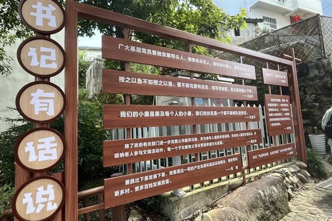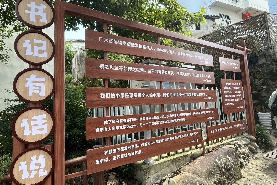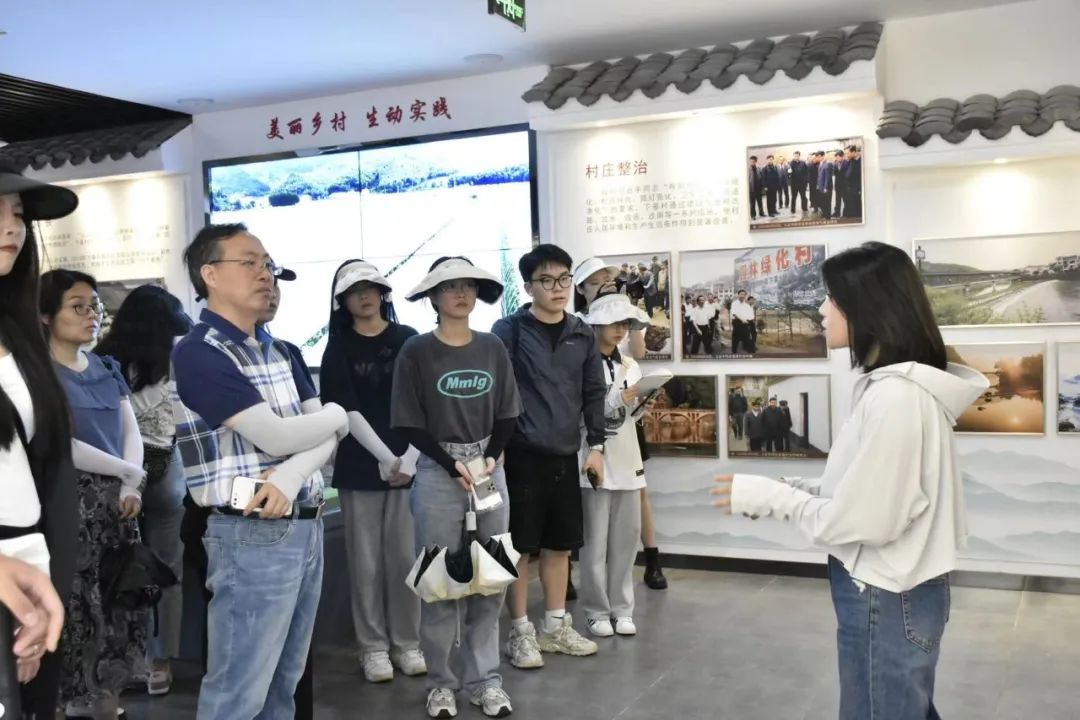 远山青翠,大河奔流,农舍白墙黑瓦,井然有序,服务队员们在思源亭前读着习近平总书记写给下姜村村民的一封信,字里行间无一不体现着习近平总书记对村民们的殷殷关怀。在下姜村书记姜丽娟的带领下,一行人参观了乡村振兴馆,通过观看照片、文件,感受下姜村近年来的卓越发展,下姜村从一个贫困山村一跃成为了“浙江最美乡村”,这离不开党和各级领导的帮助及村民们的不懈努力。