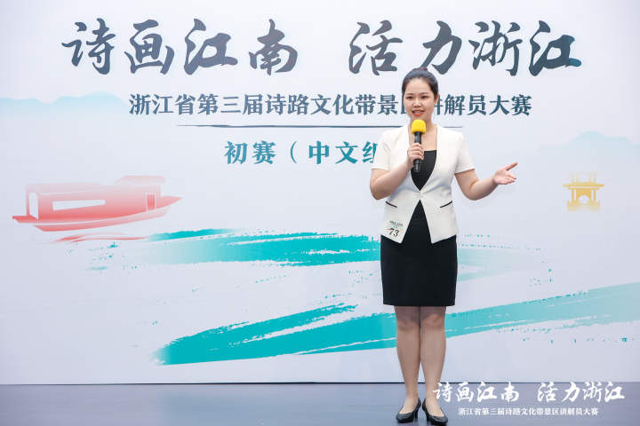 初赛当天,在完成线上知识答题考核后,选手们围绕“我心中的‘诗画江南 活力浙江’”主题进行现场讲解,限时2分钟。日前,在浙江省第十五次党代会报告中,“诗画江南、活力浙江”这一省域品牌主题词正式官宣。聚焦这一主题,让选手们更深切地感受到,景区讲解员要紧扣时代脉搏——不仅仅是“千言万语”和“千山万水”,也需要“千变万化”和“千丝万缕”。