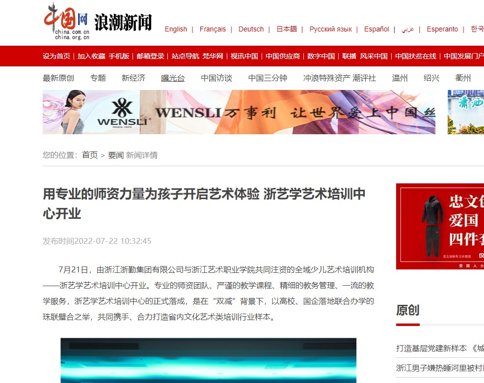 中国网浪潮新闻:用专业的师资力量为孩子开启艺术体验 浙艺学艺术培训中心开业
