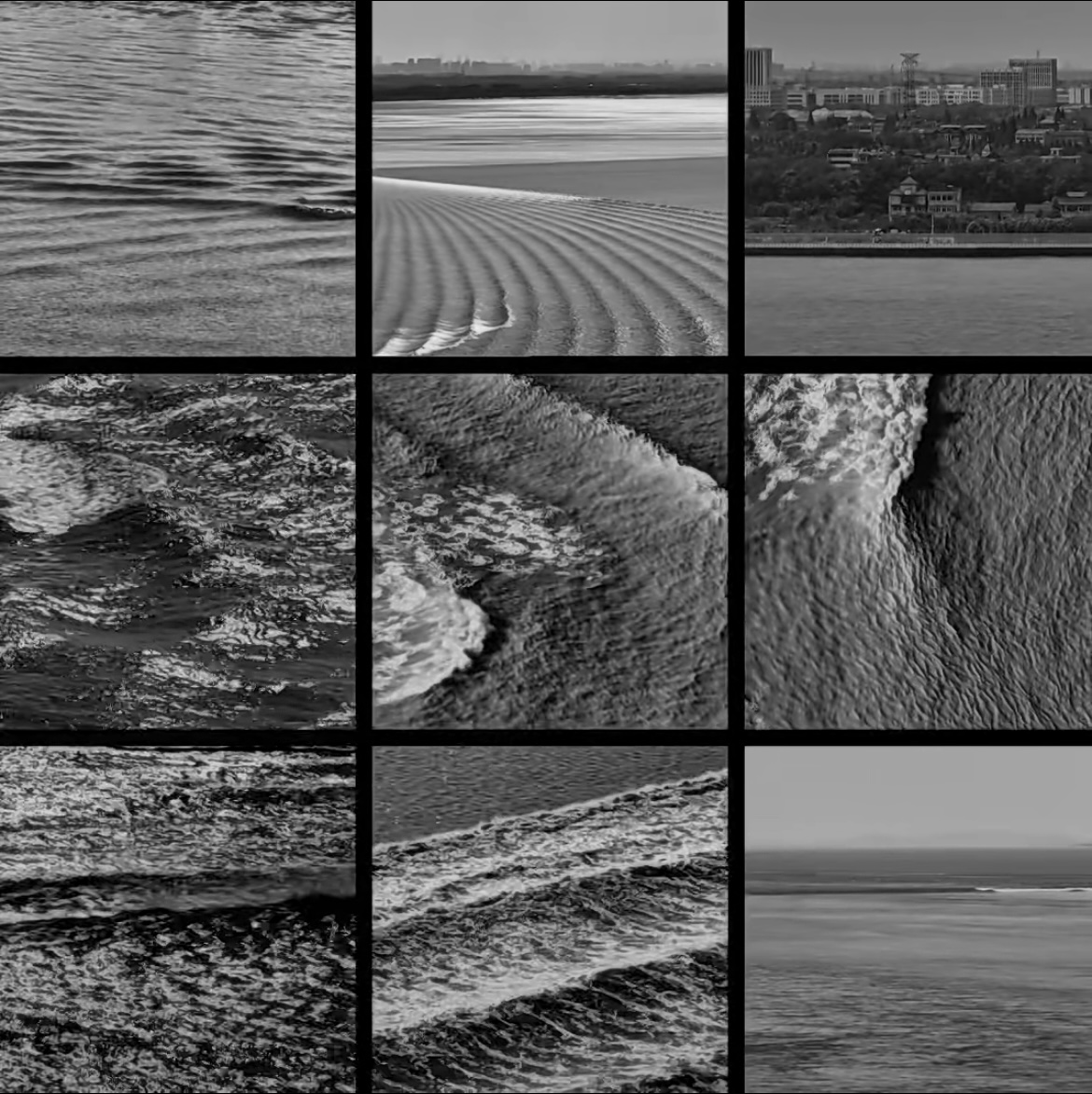 《回头潮》的创作形式是新颖的,改变了以往的构图方式,采用方形构图,将片段拼合成九宫格的形式,将潮水的形式感衔接在一起。