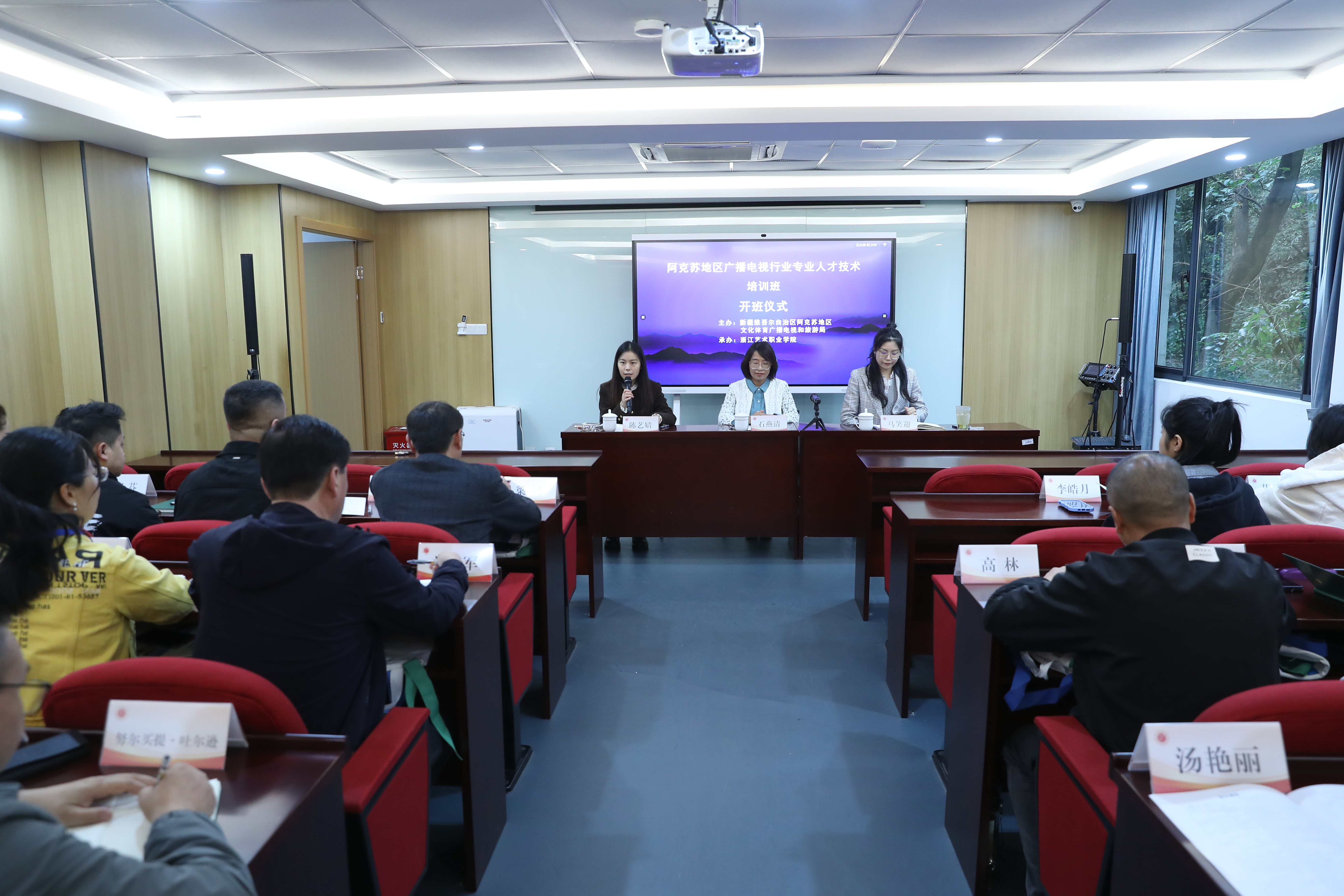 继续教育学院六级职员马笑迎致欢迎辞。她表示,2023年是全面贯彻落实党的二十大精神的开局之年,也是习近平总书记作出“加快传统媒体和新兴媒体融合发展”重要指示10周年,在这个特殊的年份,浙艺继去年之后再次承办阿克苏地区广电专业人才培训班,意义非凡。她希望学员们能珍惜本次培训机会,以习近平总书记的全媒体理念为指引,以极大的创作热情,打造优质新闻产品,并在媒体融合的考验中不断锤炼“脚力、眼力、脑力、笔力”,踏着中华民族伟大复兴的时代节拍、书写时代华章。