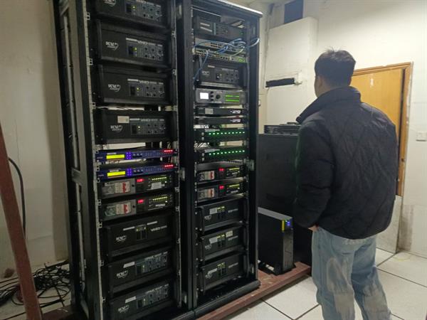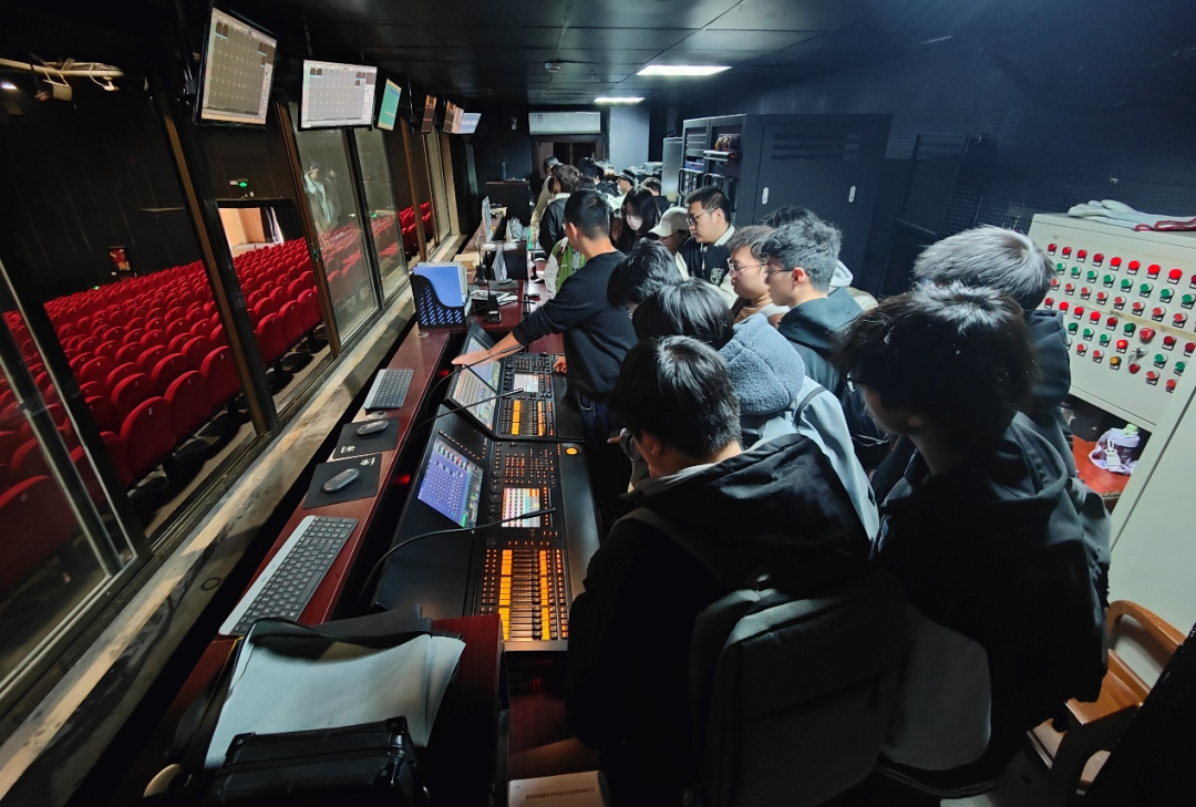 同学们在音响老师的带领下学习调音设备的使用方法,了解多样化的调音技巧,领略不同分贝的声音在舞台上的呈现效果,感受全景声的魅力。