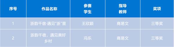 近日,第二十二届浙江省大学生多媒体作品设计竞赛决赛在浙江师范大学举行。由我院广告艺术设计专业商易文老师指导,21级广告艺术设计专业的学生王欣颖创作的《浙韵千宿·遇见“浙”里》和冯乐创作的《浙韵千宿,遇见美好乡村》在比赛中荣获三等奖。