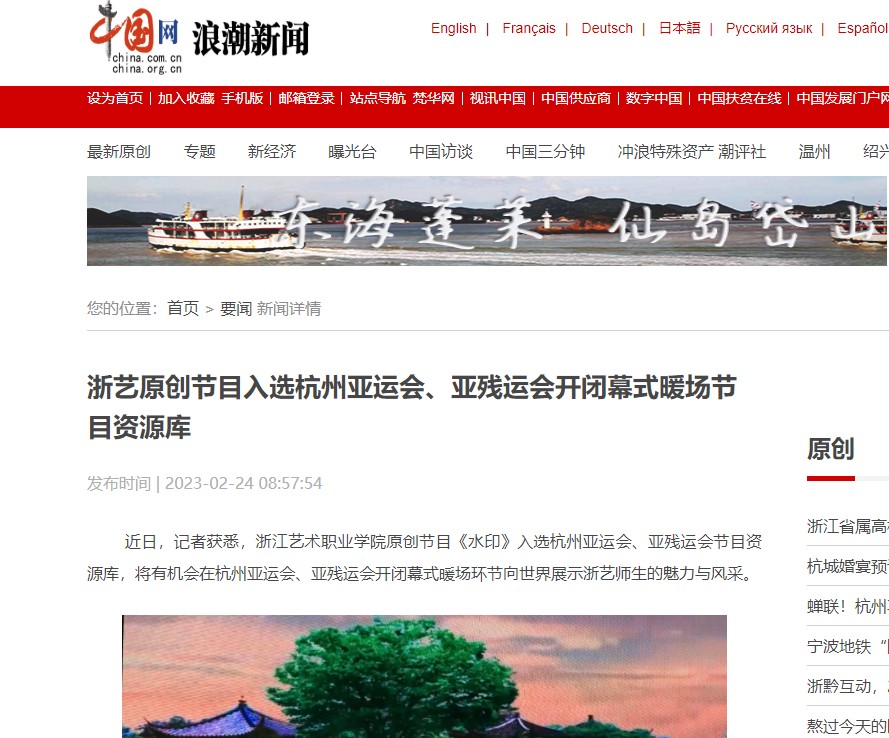 中国网浪潮新闻:浙艺原创节目入选杭州亚运会、亚残运会开闭幕式暖场节目资源库