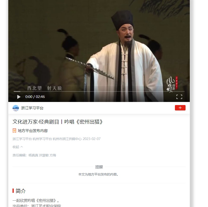 学习强国浙江平台:文化进万家·经典剧目丨吟唱《密州出猎》