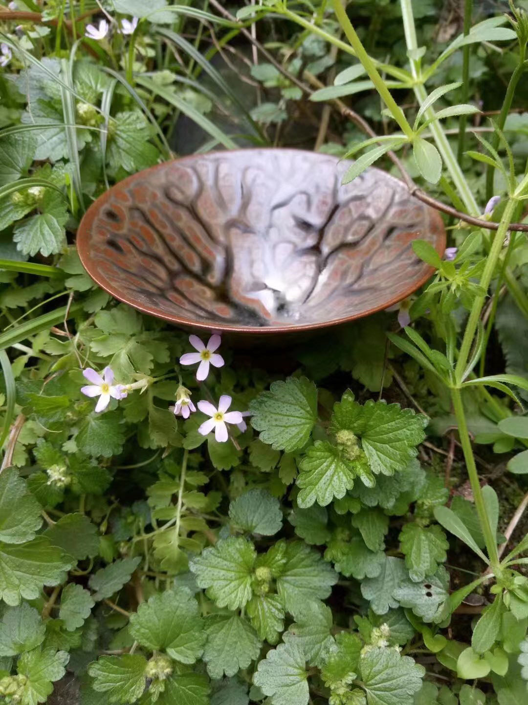 《草木灰釉刻划花斗笠碗》