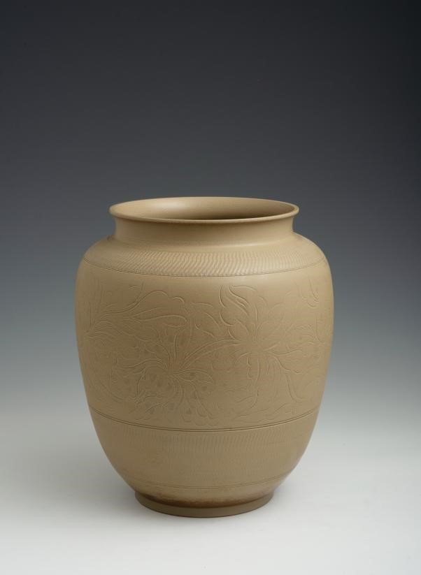 《灰釉刻花牡丹瓶》