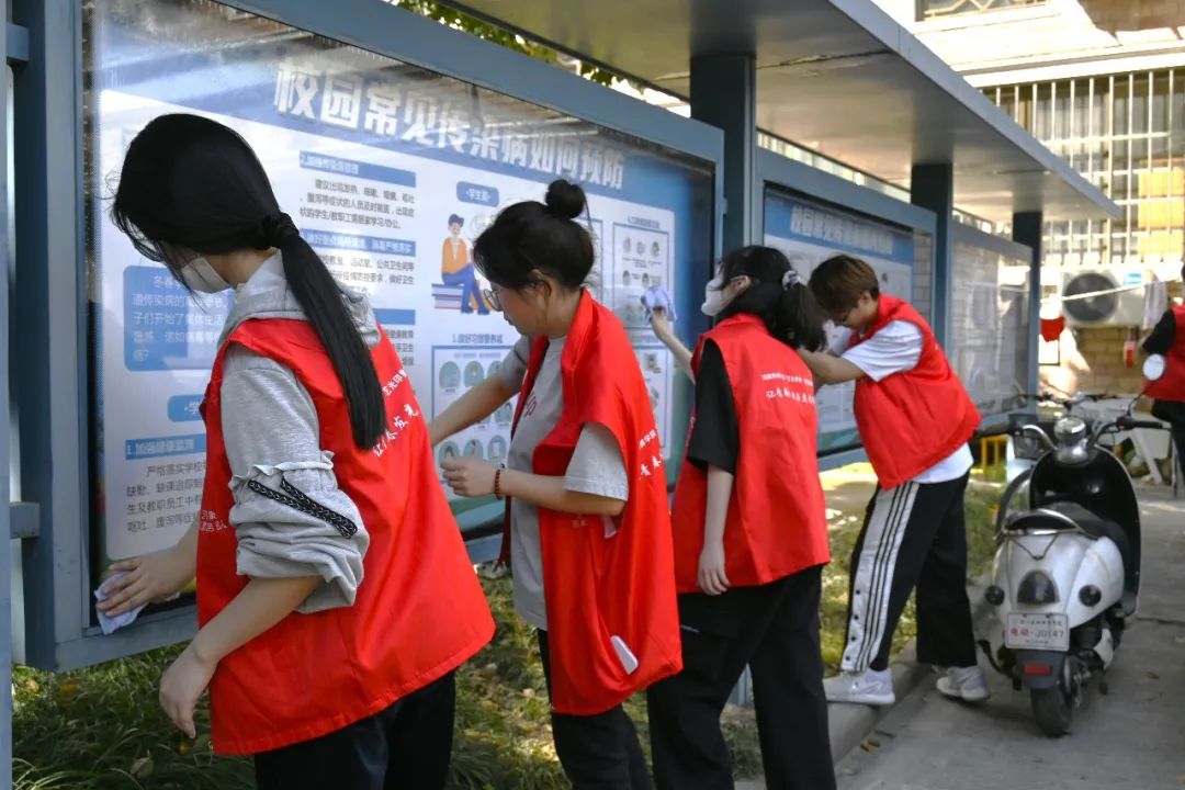 活动感悟:我们擦拭学校5号楼楼前、4号楼1楼、食堂大门口的宣传栏,不放过任何一个死角。看到变得干净整洁的宣传栏,我们感到十分得欣喜。宣传栏是一个重要的文明宣传媒介和舆论引导阵地,是为同学们提供最新资讯信息的窗口,我们在行动中使宣传栏更好地发挥其宣传效果。