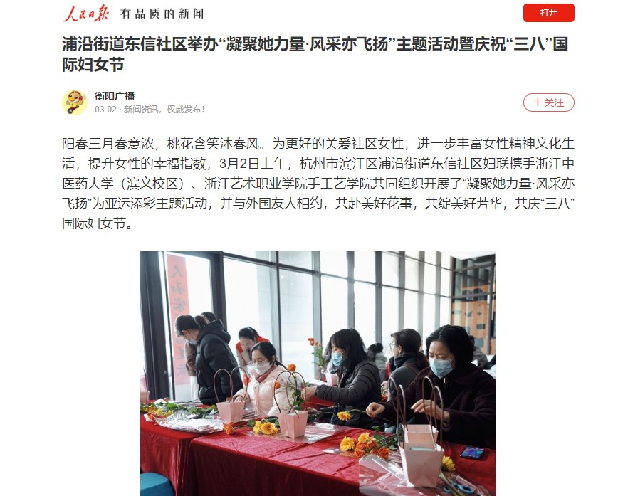 人民日报:浦沿街道东信社区举办“凝聚她力量·风采亦飞扬”主题活动暨庆祝“三八”国际妇女节