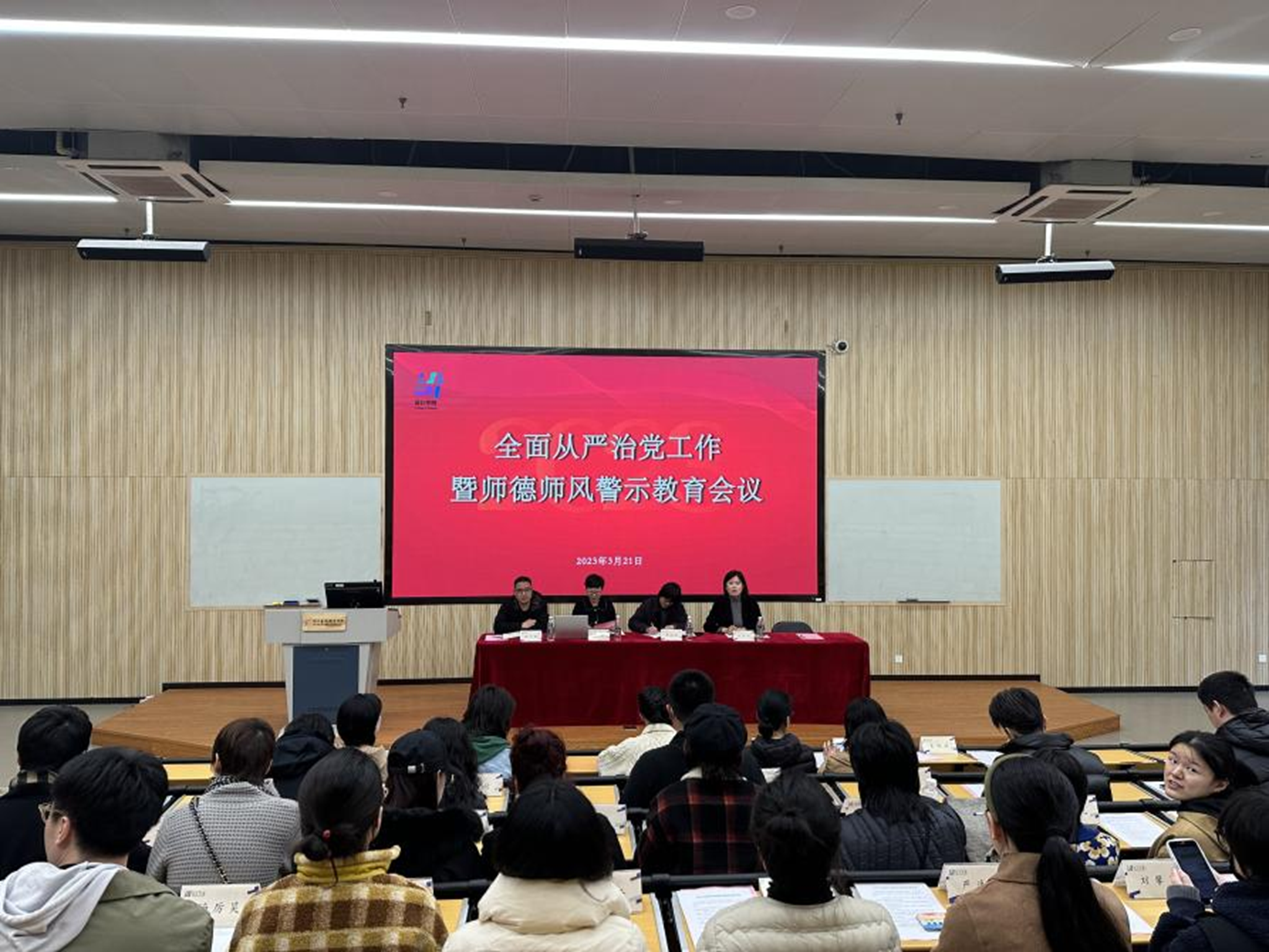 党总支专职副书记顾才铭作师德师风警示教育,传达部署了学校2023年全面从严治党工作会议精神。他强调,要以建设“勤廉学校”为牵引,重点抓好以下工作:一要坚定不移加强政治建设,抓好政治学习、政治引领、抓好政治监督。二要坚定不移抓牢立德树人根基,全力提高“三全育人”质效,着力打造精品思政。三要坚定不移推进强基固本,建强基层党组织战斗堡垒,推动党建创优。四要健全全面从严治党体系,严格执纪问责,狠抓工作实效,奋力确保风清气正的育人环境。顾才铭就2022届毕业生就业率及满意度调研情况作了详细分析。