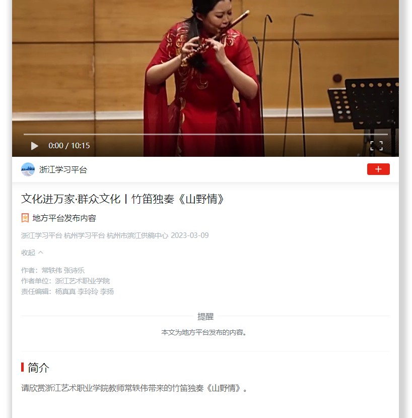 学习强国浙江平台:文化进万家·群众文化丨竹笛独奏《山野情》
