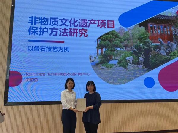田茵茵开展《非物质文化遗产项目保护方法研究》主题讲座。她从非遗与生活出发,分享非物质文化遗产的范畴,论述了当前非物质文化遗产保护存在的矛盾,重点讲述了都市文明与乡村文化、旅游开发与文化活动与非遗的关系。她认为,需要从构筑非遗保护共同体、科学提高保护水平、实现社会文化自觉、实现全民文化自信等方式来实现非遗保护目标路径。她以叠石技艺为例具体讲述了对非遗项目保护的方法。讲座结束后,杭州市赠送给公共文化教研室一套《叠石技艺》著作。
