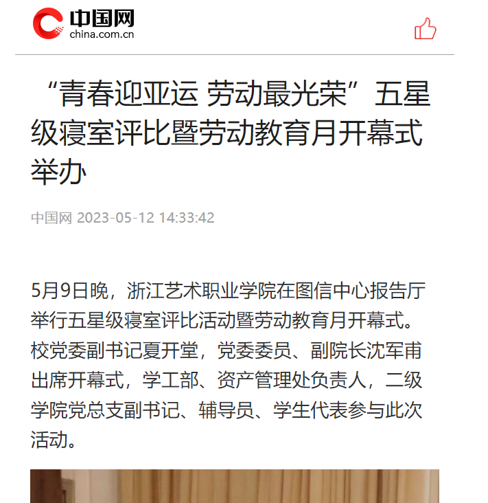 中国网:“青春迎亚运 劳动最光荣”五星级寝室评比暨劳动教育月开幕式举办