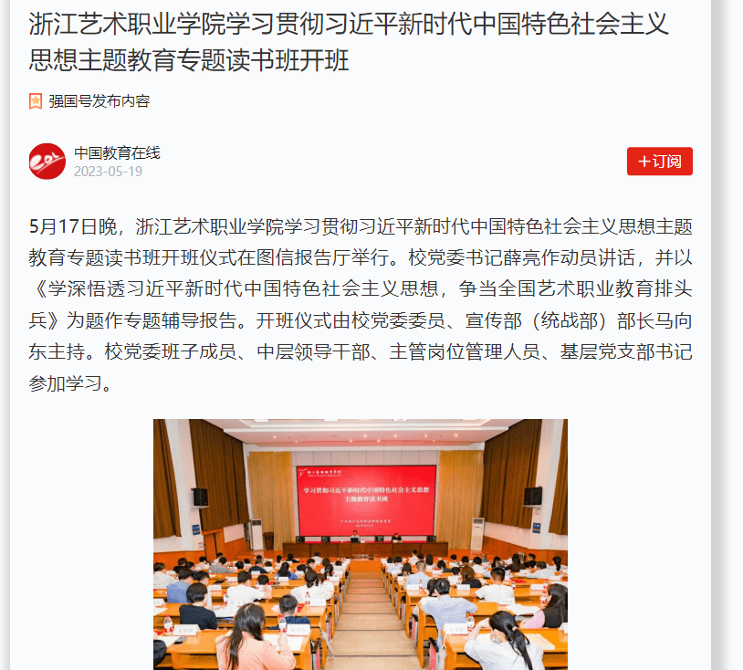 薛亮作读书班首场专题辅导报告。他从准确把握当代中国的历史方位、深刻理解习近平新时代中国特色社会主义思想的丰富内涵等两个方面深刻阐述了习近平新时代中国特色社会主义思想的重大意义和历史地位。他结合学校实际,希望读书班全体学员以坚持立德树人根本任务、坚持产教融合校企合作、坚持“双高”引领提质培优、坚持做强中职做大高职、坚持文旅融合守正创新、坚持大抓基层重抓党建等“六个坚持”为指导,在人才培养、课程建设、学科建设、师资队伍建设、特色教学资源开发与利用等方面融会贯通,持续推动学校“十四五”高质量发展,努力争当全国艺术职业教育排头兵。