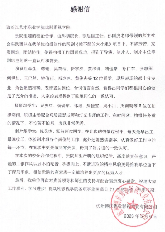 那刚对学生们的进步和成长表示欣慰:“此次拍摄虽然时间短,但每位师生都受益匪浅。感谢剧组各位老师的指导与关照,期待未来能有更多的合作项目。微短剧《睡不醒的大小姐》预计今年下半年将在Z视界或腾讯上映,预祝热映大卖,火爆全网,收视长虹。”
