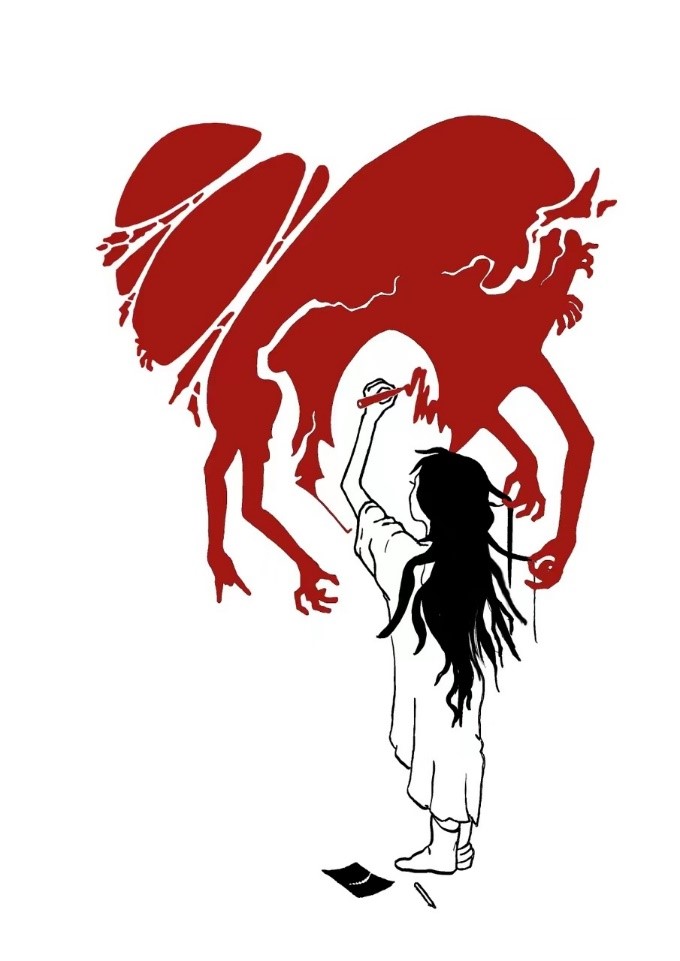 本画介绍的是负面情绪如鬼怪蛰伏于心内,稍不注意,它就缠你、绕你直至囚禁,让你在犹豫动摇与勇敢克制间徘徊不定,终艰难前行,一点点撕破暗夜烈火,无畏黑暗遮目。