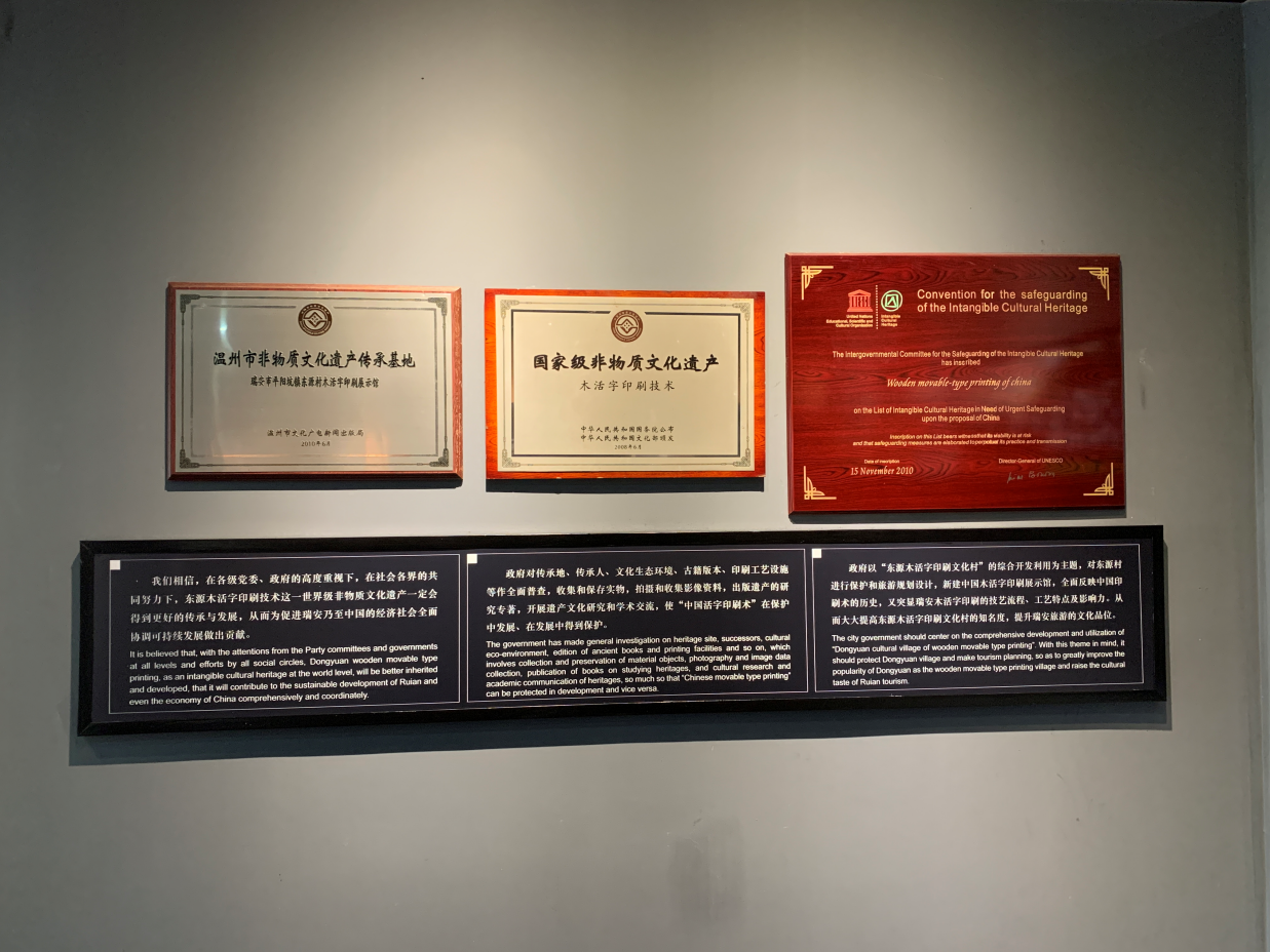瑞安东源木活字印刷术是我国已知唯一保留下来且仍在使用的木活字印刷技艺,迄今已有800多年历史,已传承23代人。之所以仍能流传,维系于当地寻根修编家谱族谱的传统,每隔20年左右,每个宗族续修一次。木活字印刷术分为刻字、检字、排版、校对、印刷、打圈、划支、填字、分谱、草订、切谱、线装等二十道工序,技术严格遵循古法,工艺十分考究。2008年,瑞安的“木活字印刷技术”列入第二批国家级非物质文化遗产名录,2010年,作为“中国活字印刷术”现存的唯一载体,被联合国教科文组织列入“急需保护的非物质文化遗产名录”。