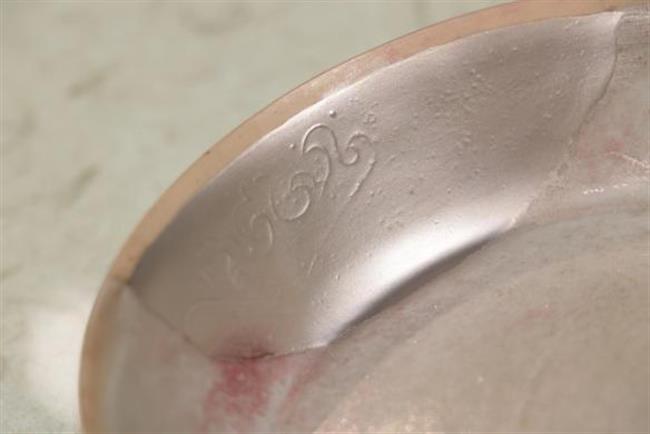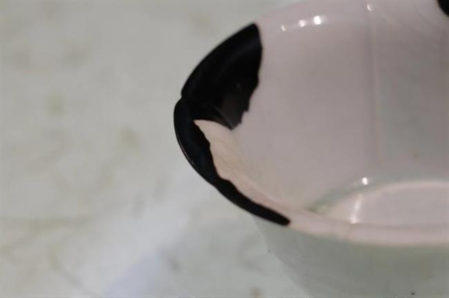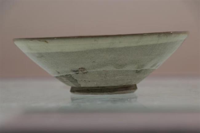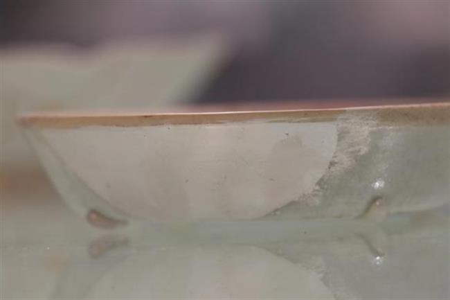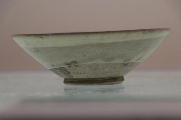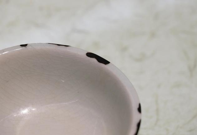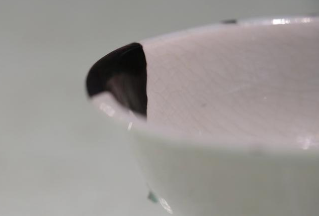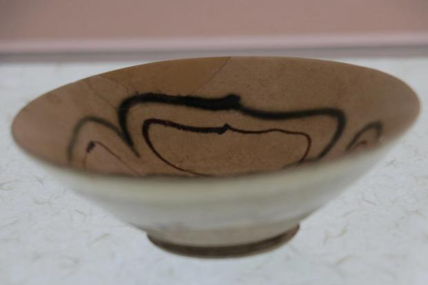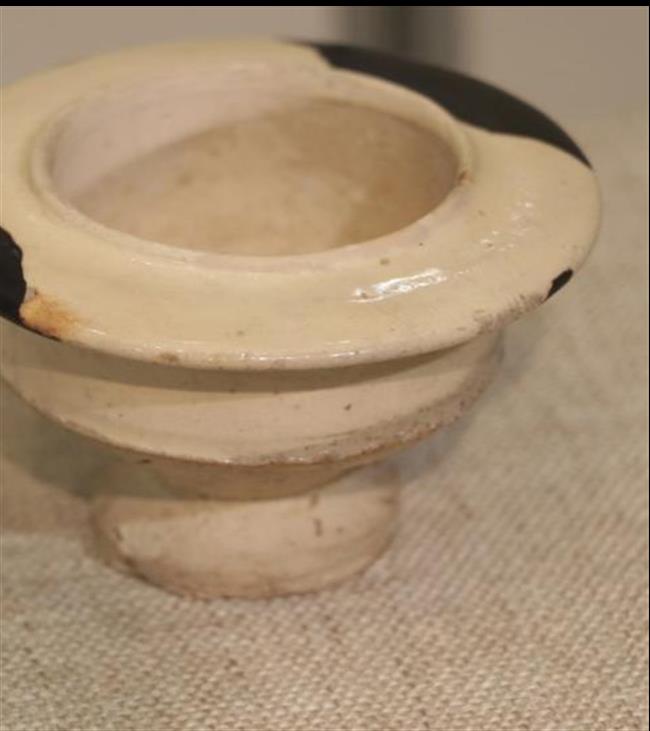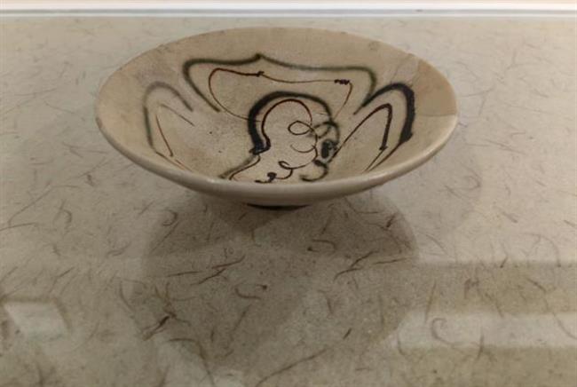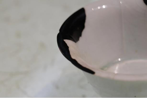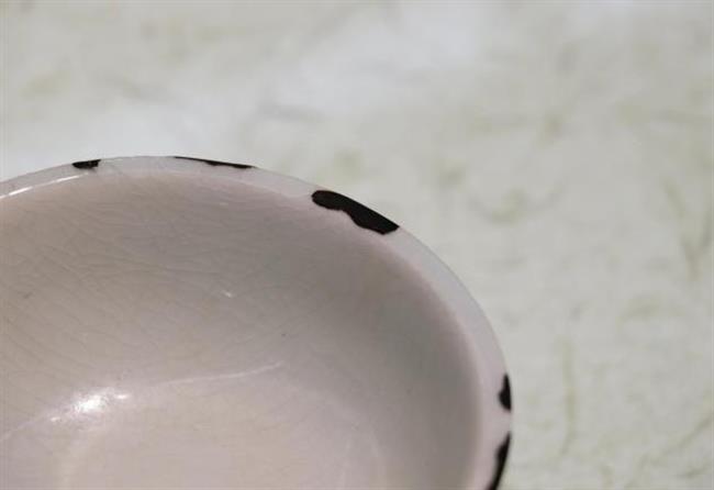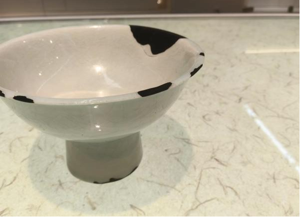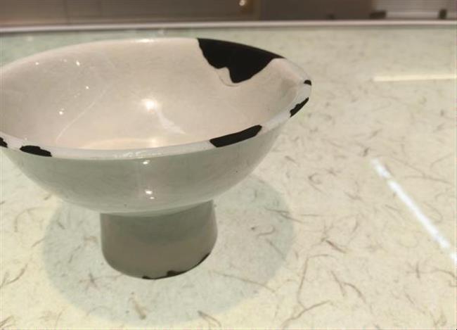 作品简介:唐代长沙窑小碗,釉层保存完整,碗内饰草纹,口沿有缺,使用原子灰并用腰果漆调色修复。