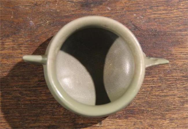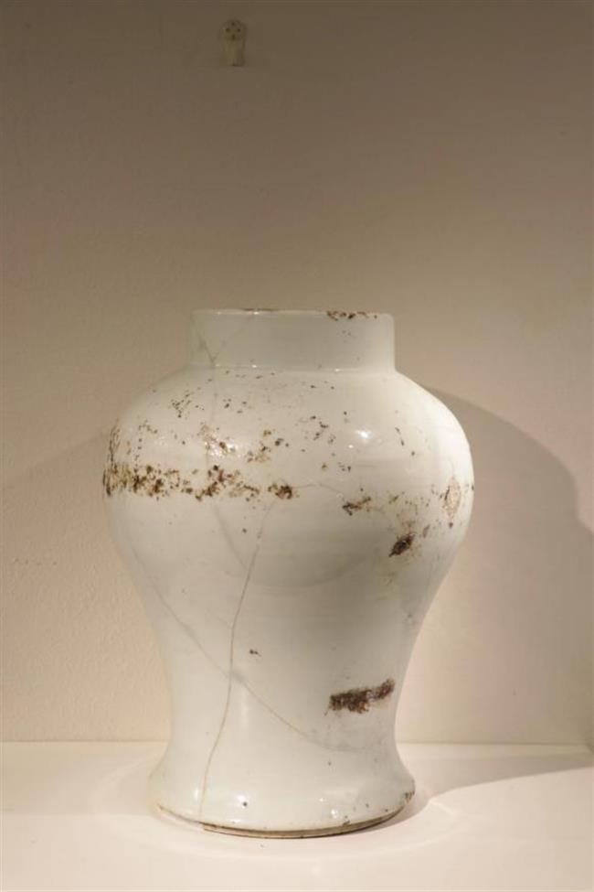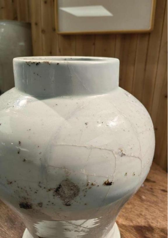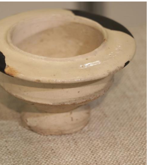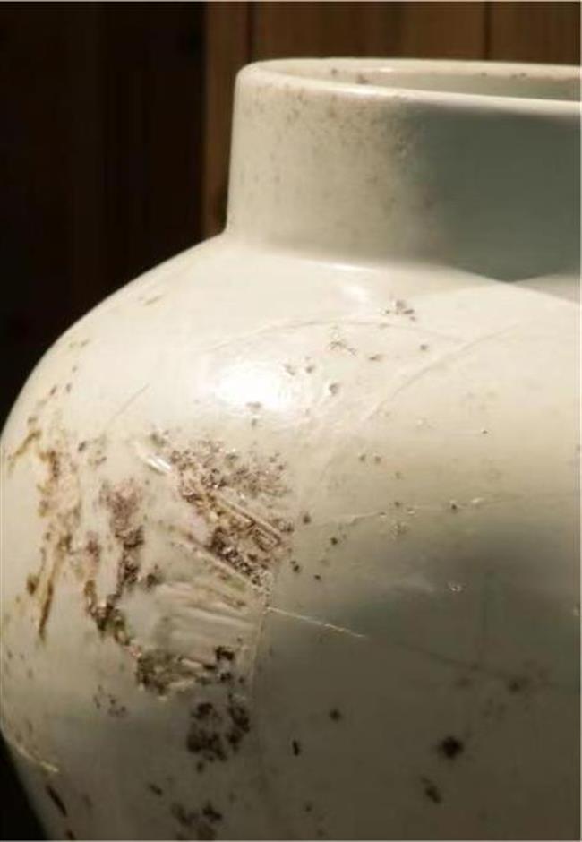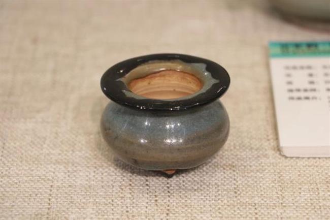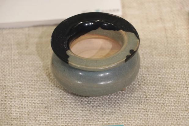 作品简介:平沿,口沿微外撇,束颈,鼓腹,中心无釉,遗留有墨书款。器身破损,耳朵损坏一只,两条足损毁,采用博物馆修复方式,使用石膏修补。