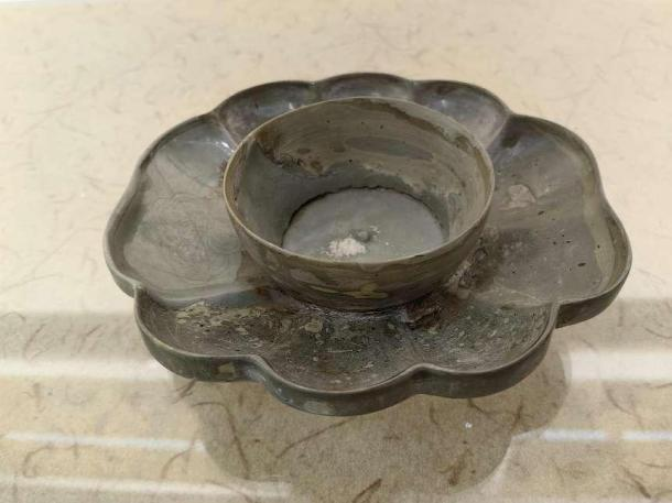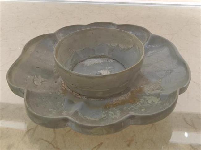 作品名称:越窑青釉曲瓣盏托