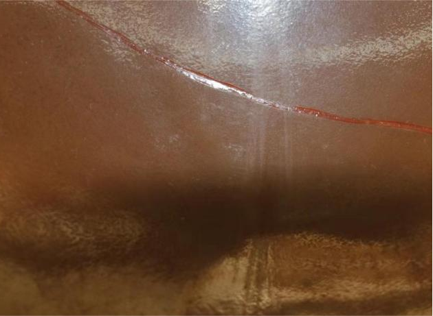 作品简介:该器物表面光滑,有明显小缺口,器物附有细微杂质,在修复过程中需要注重器物表面的清洁,修复时需要时刻注意缺口以外器物不被材料破坏,可以通过胶带等隔离材料来处理。器物以金膳修复为主,在修复过程中先通过瓦灰和生漆来做器物的器型底子,再施以黑漆保护器物的底子,最后用适量的红漆和金粉完成修复。