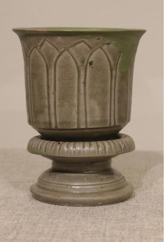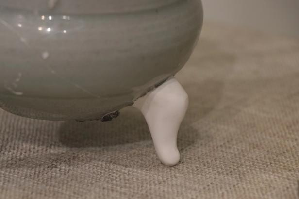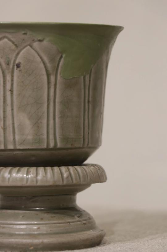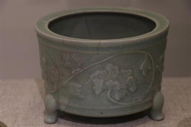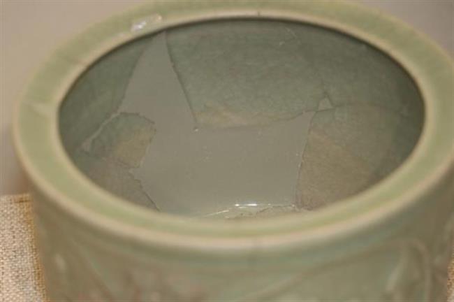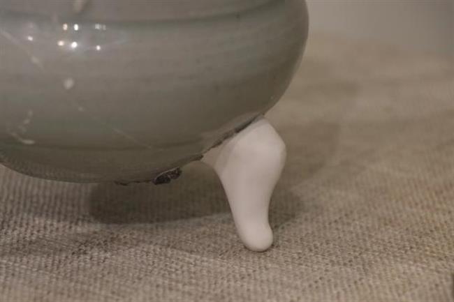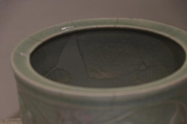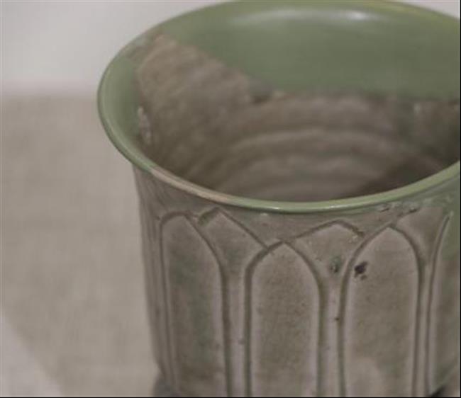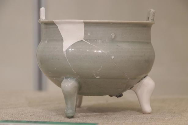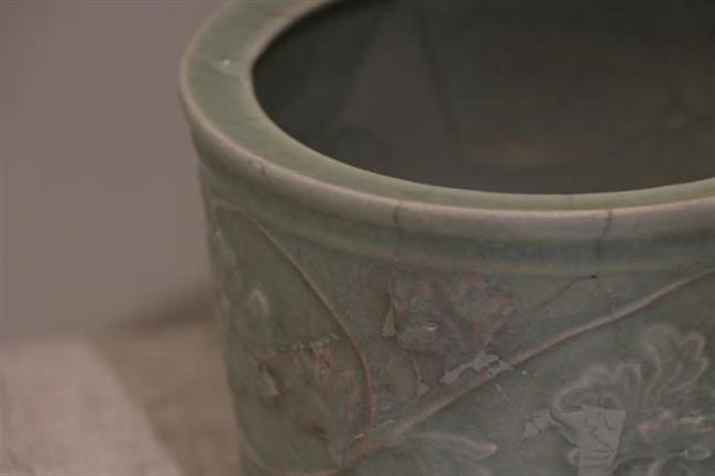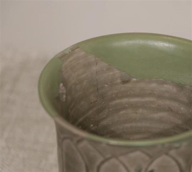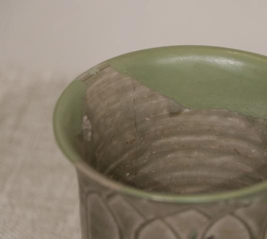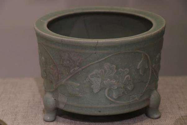 作品简介:敛口,内折沿,圆唇,筒形器身,下承三足。灰白胎,施梅子青釉。腹部贴塑缠枝牡丹纹,枝叶卷曲蔓延,整体纹饰与釉色相得益彰,辉映成趣。为确保器物修补后的可用性,采用硬度较高的原子灰进行修补。