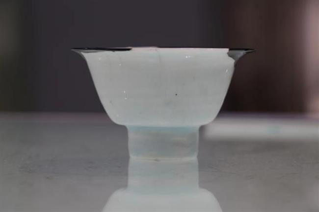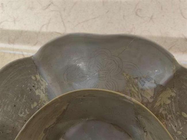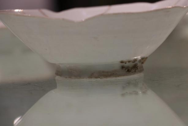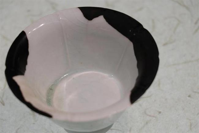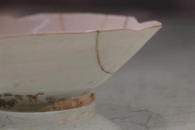 作品简介:碗口呈五瓣葵花式,斜壁内收,圈足。里外施白釉,釉色白中泛青,使用生漆进行粘接并描金。
