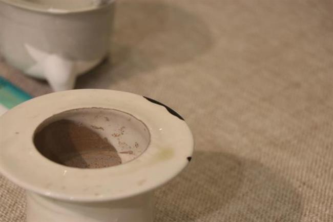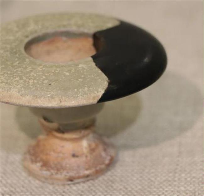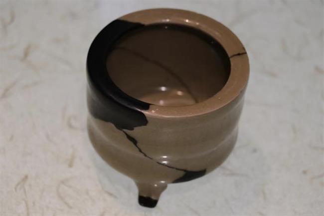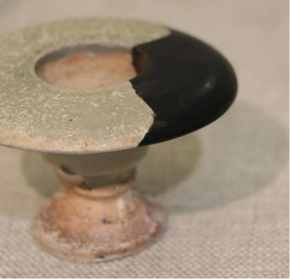 作品简介:五代越窑香薰,口沿大面积残缺,底部缺少部分,使用原子灰修复,并用腰果漆上色。