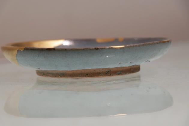 作品简介:盘敞口,浅弧腹,圈足。里、外施天蓝色釉,外壁施釉不匀,有流釉现象。口沿处釉层较薄,隐隐映出灰色胎体。圈足内无釉。作品用金缮图饰暗纹技法,结合文物本体二次创作,富有别样的艺术审美。
