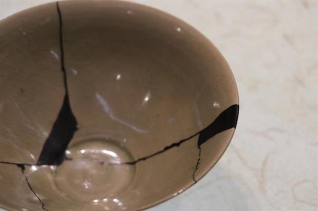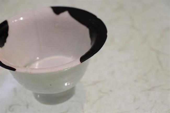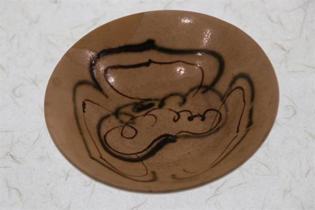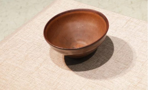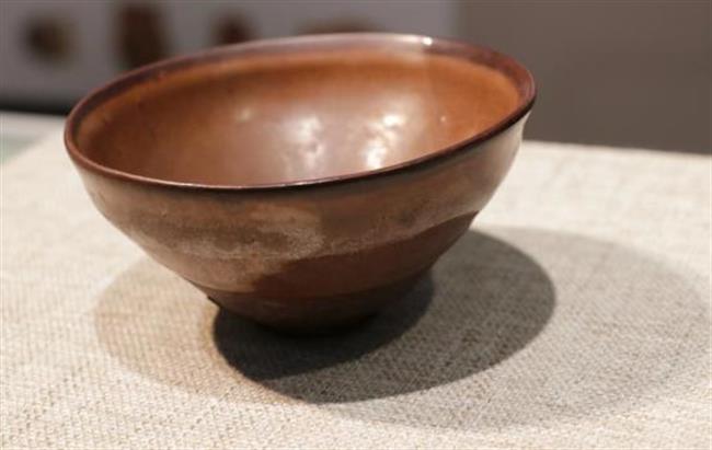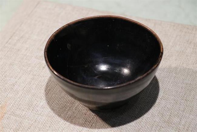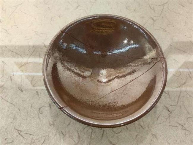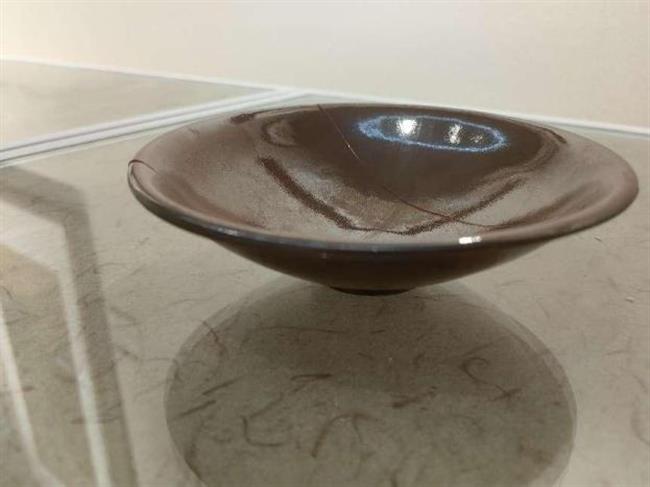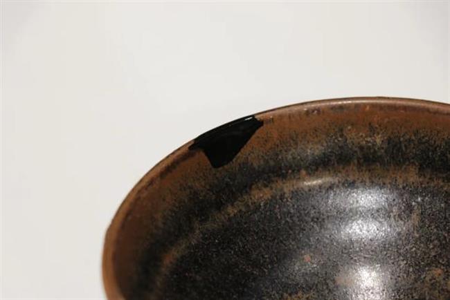作品简介:碗唇口,弧腹,圈足,近足无釉,素面无纹饰。釉为酱色,釉色较亮。酱釉瓷是宋代中期耀州窑瓷器中出现的一个新品种,为仿宋代漆器之作。使用生漆粘接并用腰果漆描线。