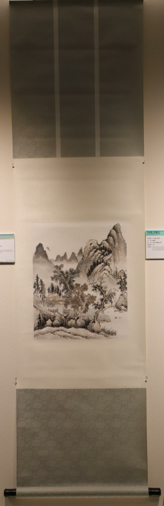 作品简介:立轴的装裱形式是一色挖镶,该图是运用淡墨层层积累,颜色用青、绿、赭少数几种颜色,虽然用的颜色少但色彩鲜明细腻丰富,清润高华。