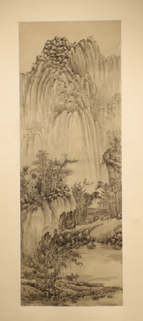 作品简介:装裱形式为传统浅黄绿色的一色裱,天真质朴、雅致清新。范宽善用的雨点皴和积墨法画法,往往给观者造成“如行夜山”般的沉郁效果,讨托出山势的险峻硬朗、气魄雄伟、境界浩莽、雄阔壮美、墨韵浓厚、笔力鼎健,其画风对后世影响极大。