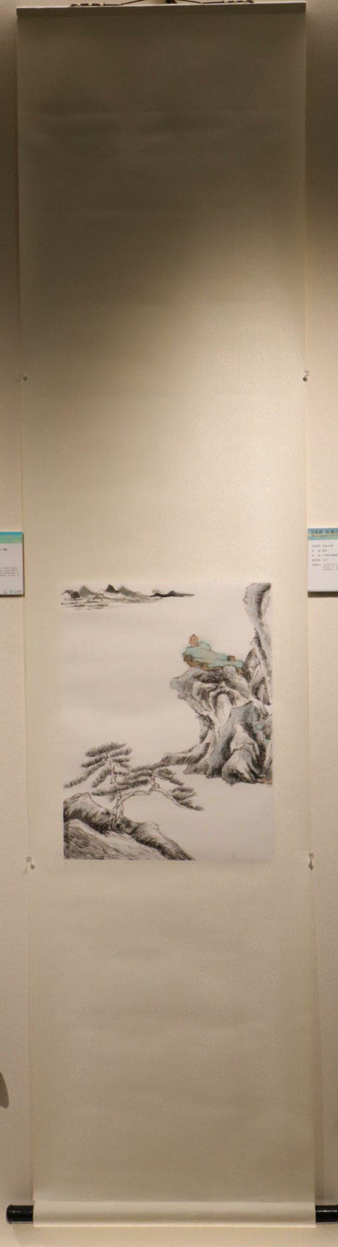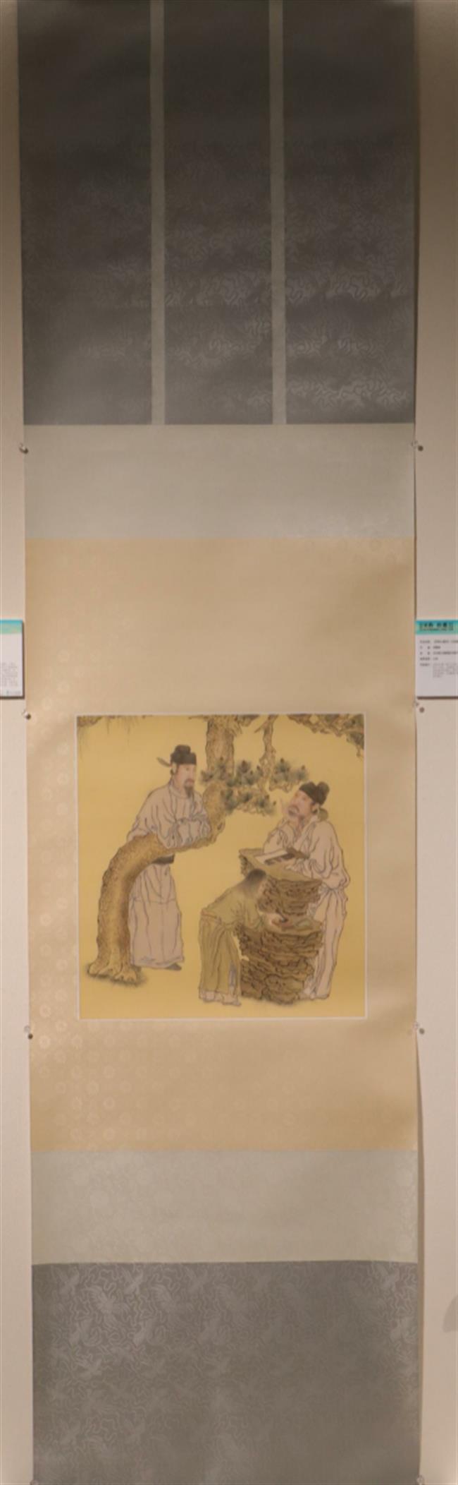 作品简介:临摹李公麟《四学士页图》,采用三色挖镶装裱形式,选用手工宣纸,且根据画芯匹配颜色协调的、带有古典花纹的绫绢材料来裱件,腹背进行压光处理,石蜡打磨保持色彩的亮丽感,手感触摸光滑柔软,使作品变得完整、增添些许魅力。