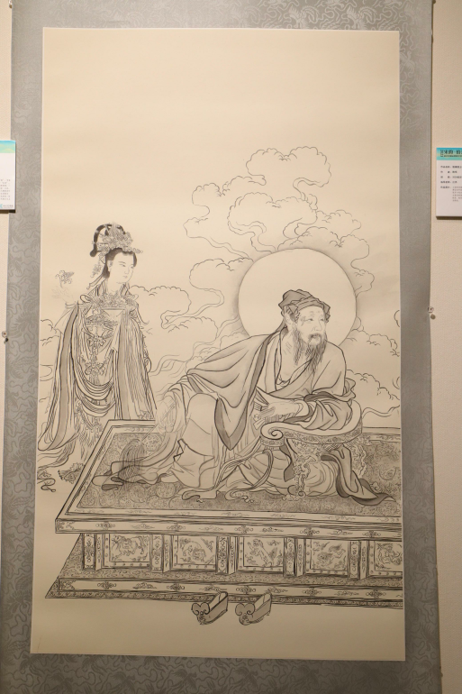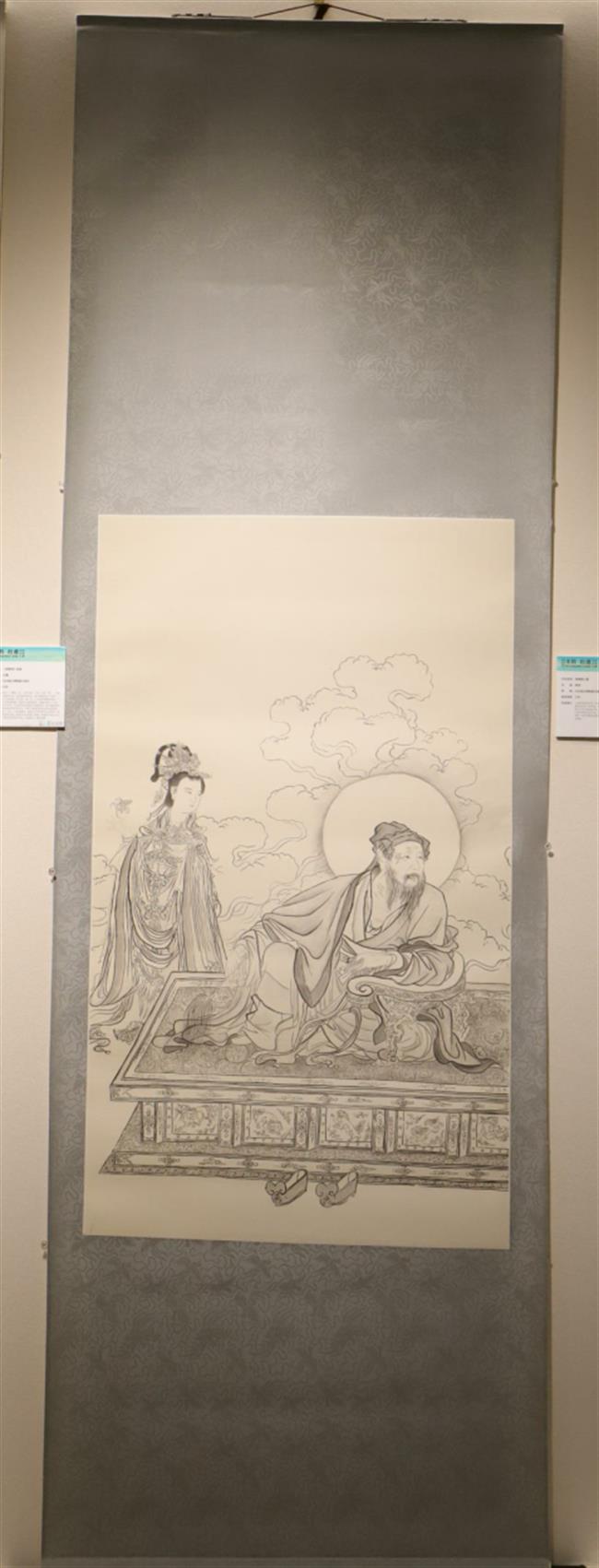 作品简介:立轴的装裱形式是一色挖镶,该画是白描的形式来展现维摩诘老年居士的形象,坐在床上,左肩斜倚着椅背,彷佛张开口发出微弱的声音,床的后侧站立着天女,以彷佛天女散花的姿态来呈现,它以简洁明快描绘出曲直、粗细、刚柔、起伏而富有韵律变化的线条,描写出对象复杂的形态特征。