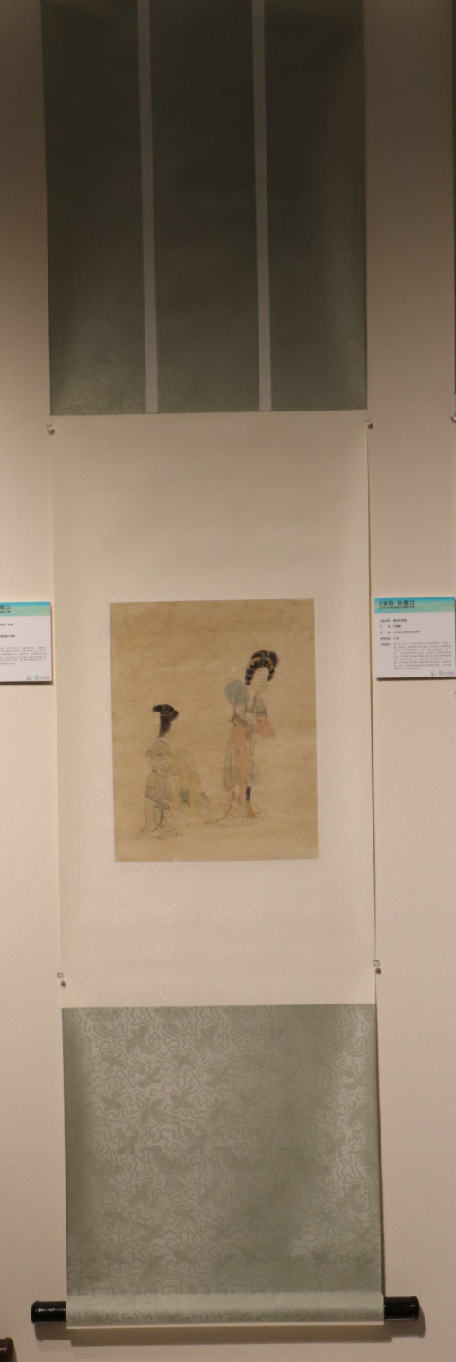 作品简介:图中两个女子,一个外披半臂,上身穿窄袖衫,下着长裙,腰束带,淡雅朴素,修长窈窕,是明代女子服饰的典型风格。在系腰的腰带上,挂着一根以丝线编成的“宫绦”,即在丝线中间打上环节,下垂至地,有的还在中间串上一块玉佩,借以贴压裙服,使其不会散开而影响优雅仪态。画面左侧有一名侍女着衫裙,腰间束带并挂一玉佩,手中托着一件衮服,衮服是皇帝在祭天地、宗庙及正旦、冬至、圣节等重大庆典活动时穿用的礼服,上衣下裳形制,以十二章纹样为饰。