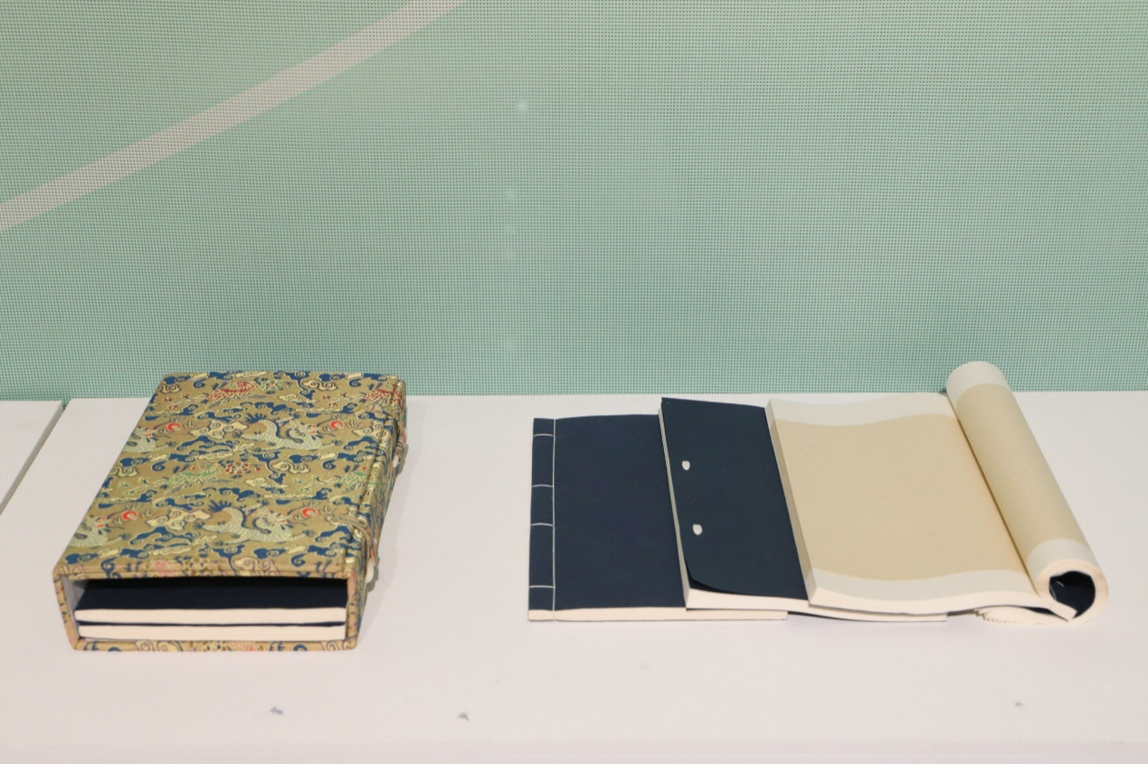 作品简介:用龙凤纹的锦、宣纸、灰板、骨签制作的四合套;其中五本古籍中分别是金镶玉、毛装、包背装、四眼线装、蝴蝶装。利用函套来存放古籍,可使其不易受污染和摩擦造成损伤,在书背处可编写书名和编号,也利于查找,所以,古籍函套在古籍保护中起到了非常重要的作用。