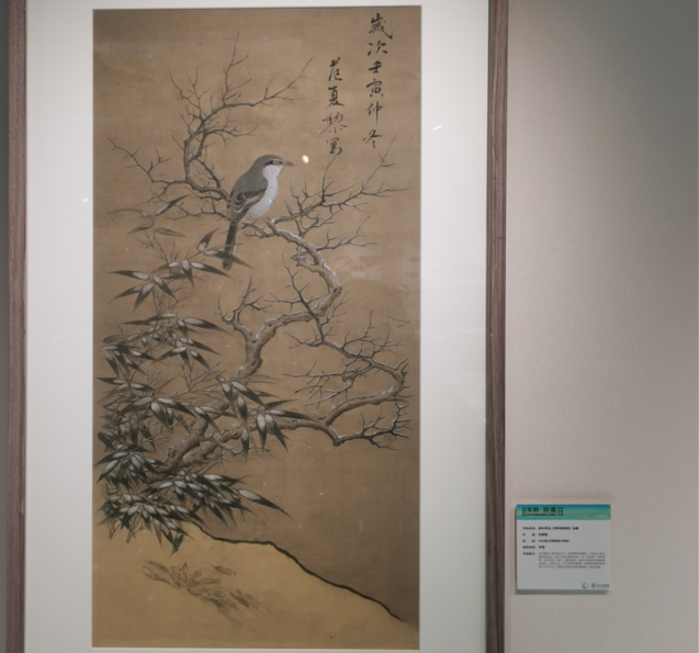 作品简介:作品描绘了覆雪的竹叶,轻染薄雪的棘枝,以及悄立枝头栖息的伯劳。图中山坡以粗笔勾出,写一丛衰草,更添雪意。双勾写竹、树干,敷色渲染。雀鸟以没骨及勾勒相结合绘出,写实生动。对于积雪的表现,直接将白粉厚涂在枝干与竹叶上,表现出积雪压枝的凝重感,清空灵逸。