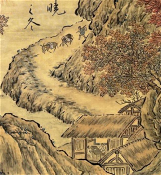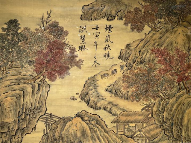 作品简介:作品描绘陕西一带的山水景色,山石连绵起伏,中部云雾笼罩,河流顺山蜿蜒,山中隐现亭台,亭中士人凭栏赏景,树木苍劲,或红叶飘飘,或硕果累累。石块和峭壁以“雨点皴”定型,无数淡墨小点叠落在岩面上。以顶天立地的章法突出雄伟壮观的气势,山麓画以丛生的密林,刻画出北方关陕地区“山峦浑厚,势状雄强”的特色。