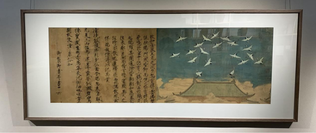 作品简介:《瑞鹤图》是北宋宋徽宗赵佶所作绢本设色画。打破了常规花鸟画的构图方法,花鸟和建筑相结合,营造了诗意的境界其不仅具神性的光辉与君主的华贵,也有仙音袅袅、高雅灵动之感。皇宫殿宇端端正正置于画面下方,均衡对称,留出三分之二湛蓝天空,有两鹤驻立,互相呼应。画面仅见宫门脊梁部分,突出群鹤翔集,庄严肃穆中透出神秘吉祥之气氛。