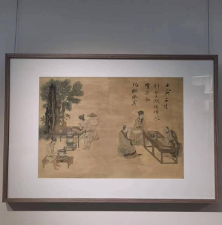 作品简介:《撵茶图》以工笔白描的手法,细致描绘了宋代点茶的具体过程。画幅左侧两人,一人正在转动石磨磨茶,神态专注,动作舒缓;另一人伫立茶案边,左手持茶盏,右手提汤瓶点茶;桌上是茶筅、茶盏、盏托以及茶箩子、贮茶盒等用器。画幅右侧共计三人:一僧人伏案执笔,正在作书;一羽客相对而坐,意在观览;一儒士端坐其旁,似在欣赏。整个画面布局闲雅,用笔生动,充分展示了宋代文人雅士茶会的风雅之情和高洁志趣,是宋代点茶场景的真实写照。